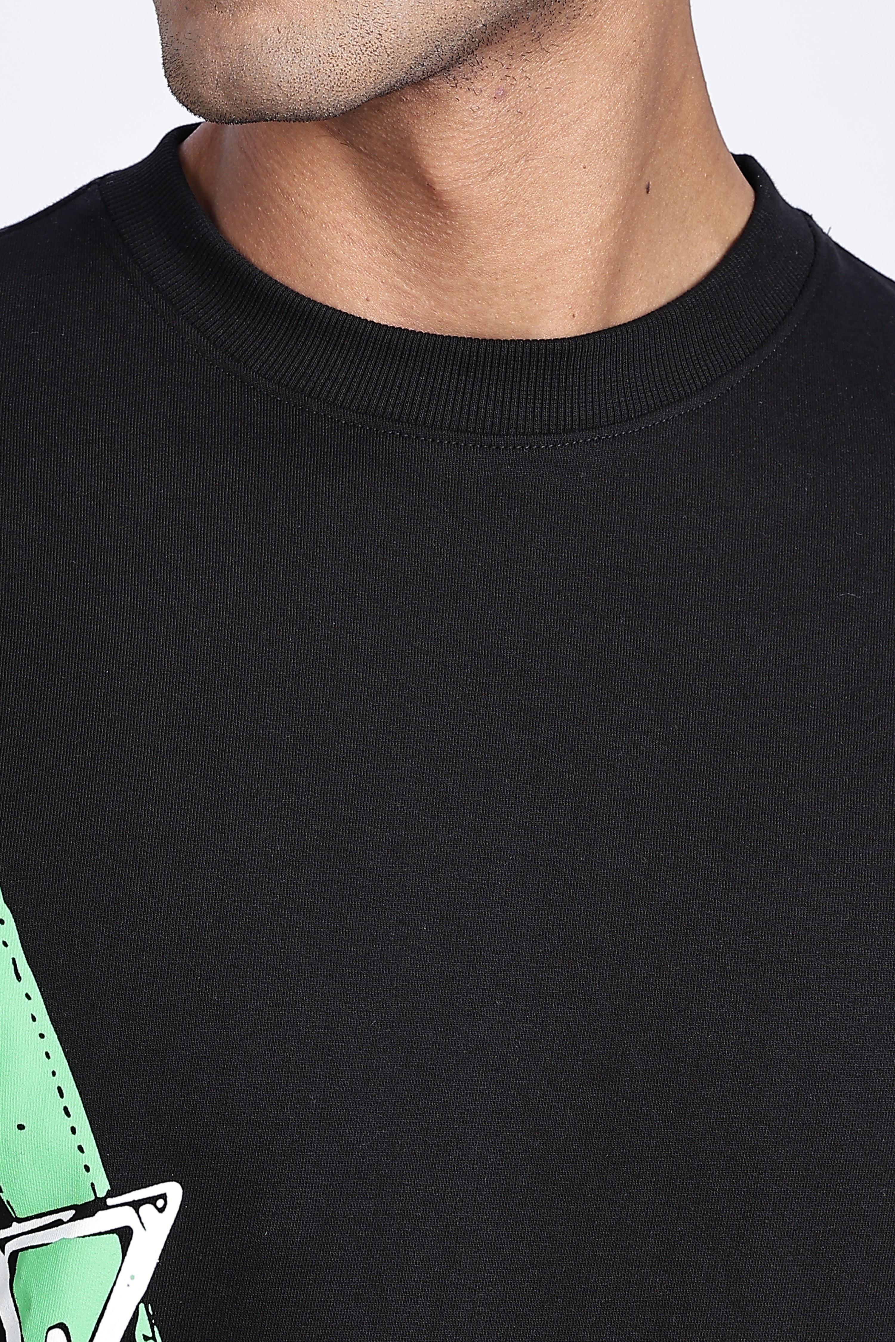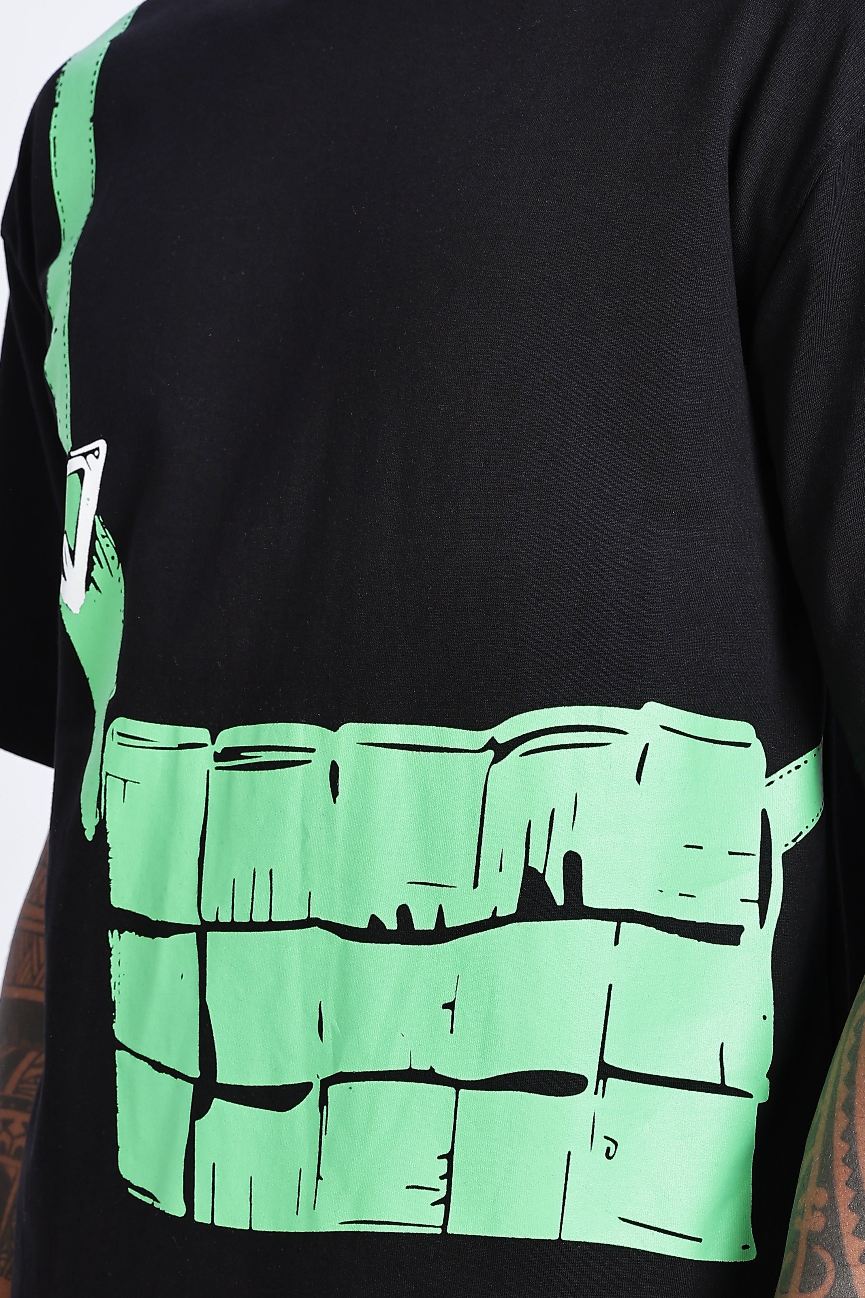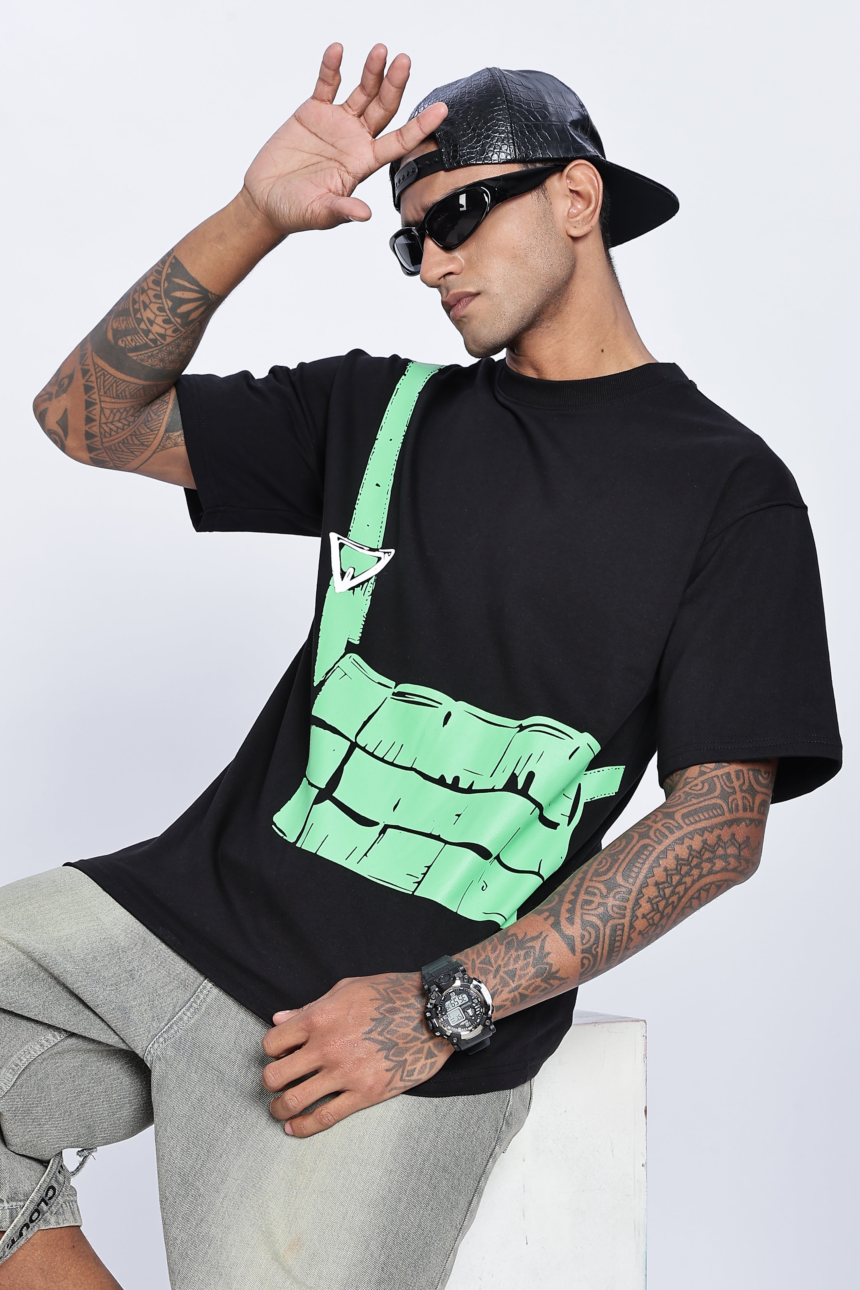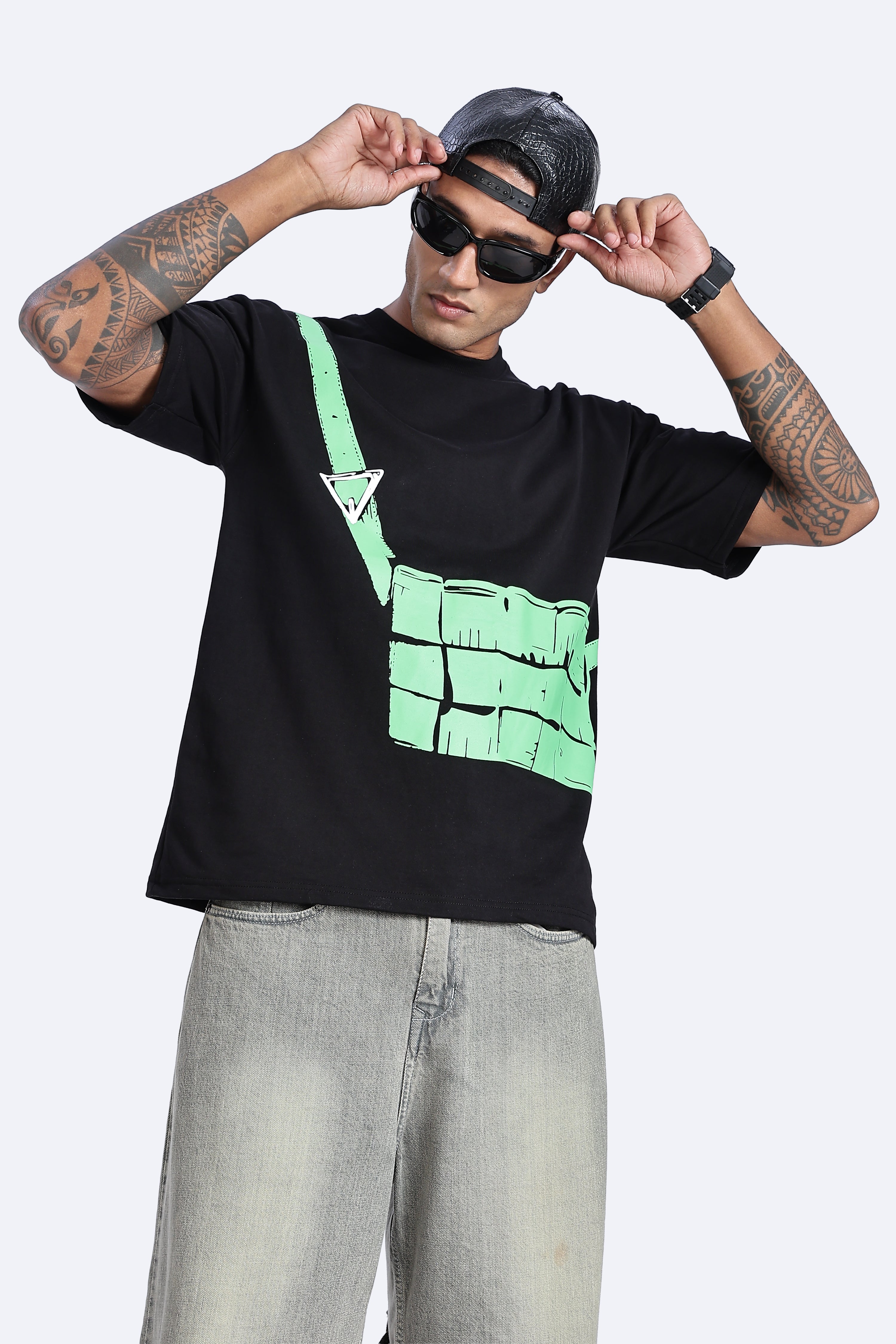 Elevate your streetwear game with this unique black t-shirt featuring a striking green chest strap and pouch graphic. The playful print creates the illusion of a crossbody bag, adding an urban twist to your everyday outfit. Designed for both comfort and creativity, this tee blends bold style with effortless wear.