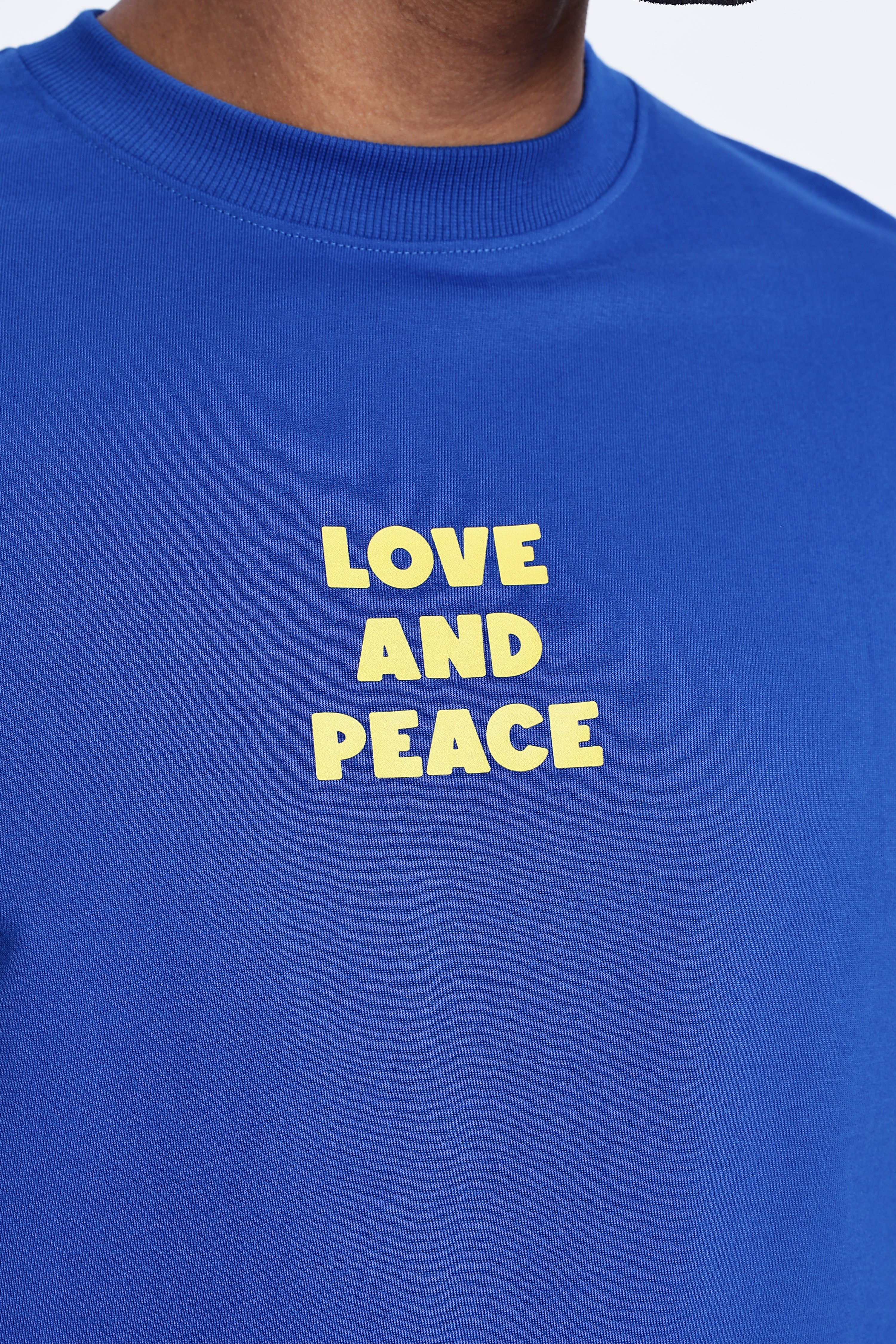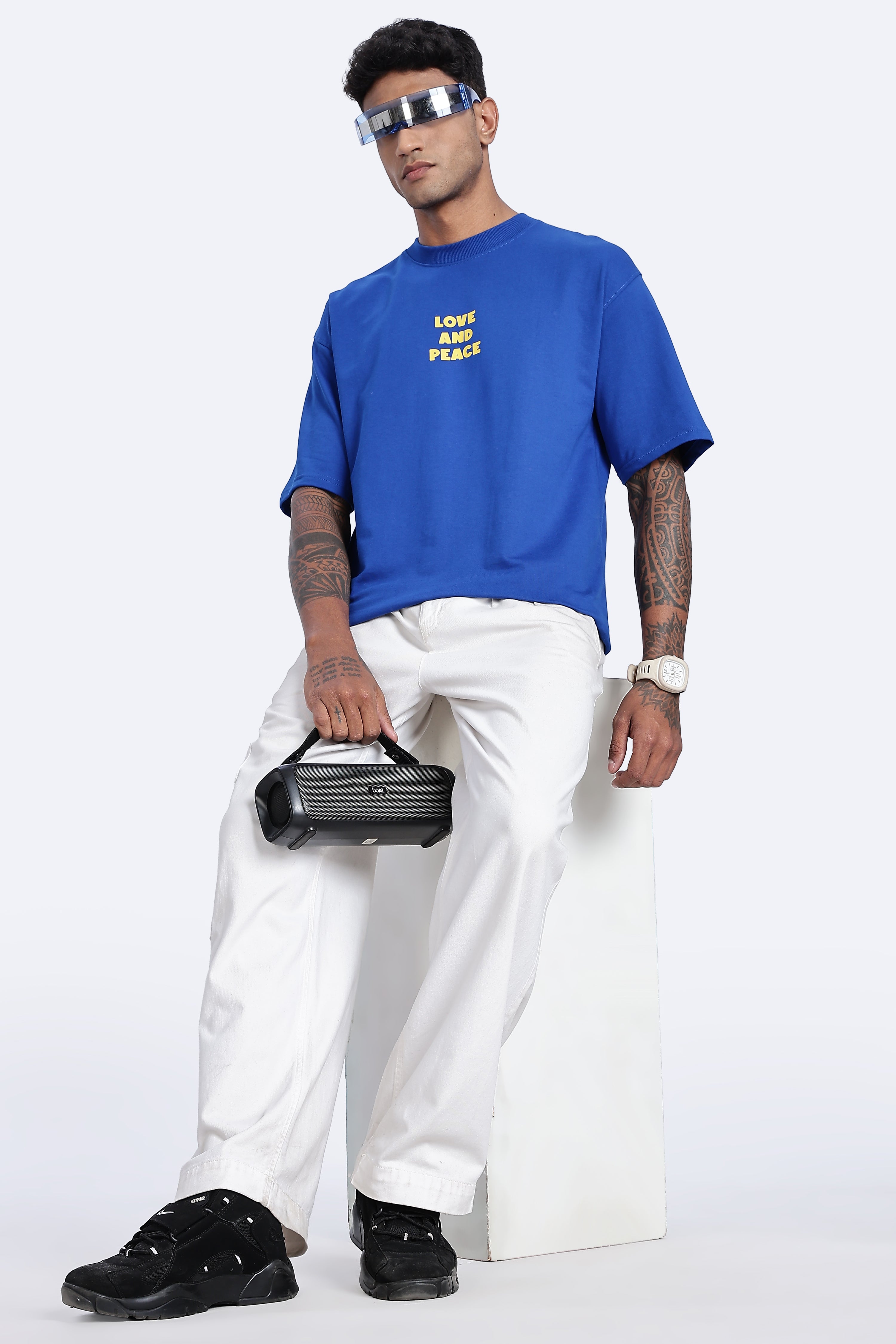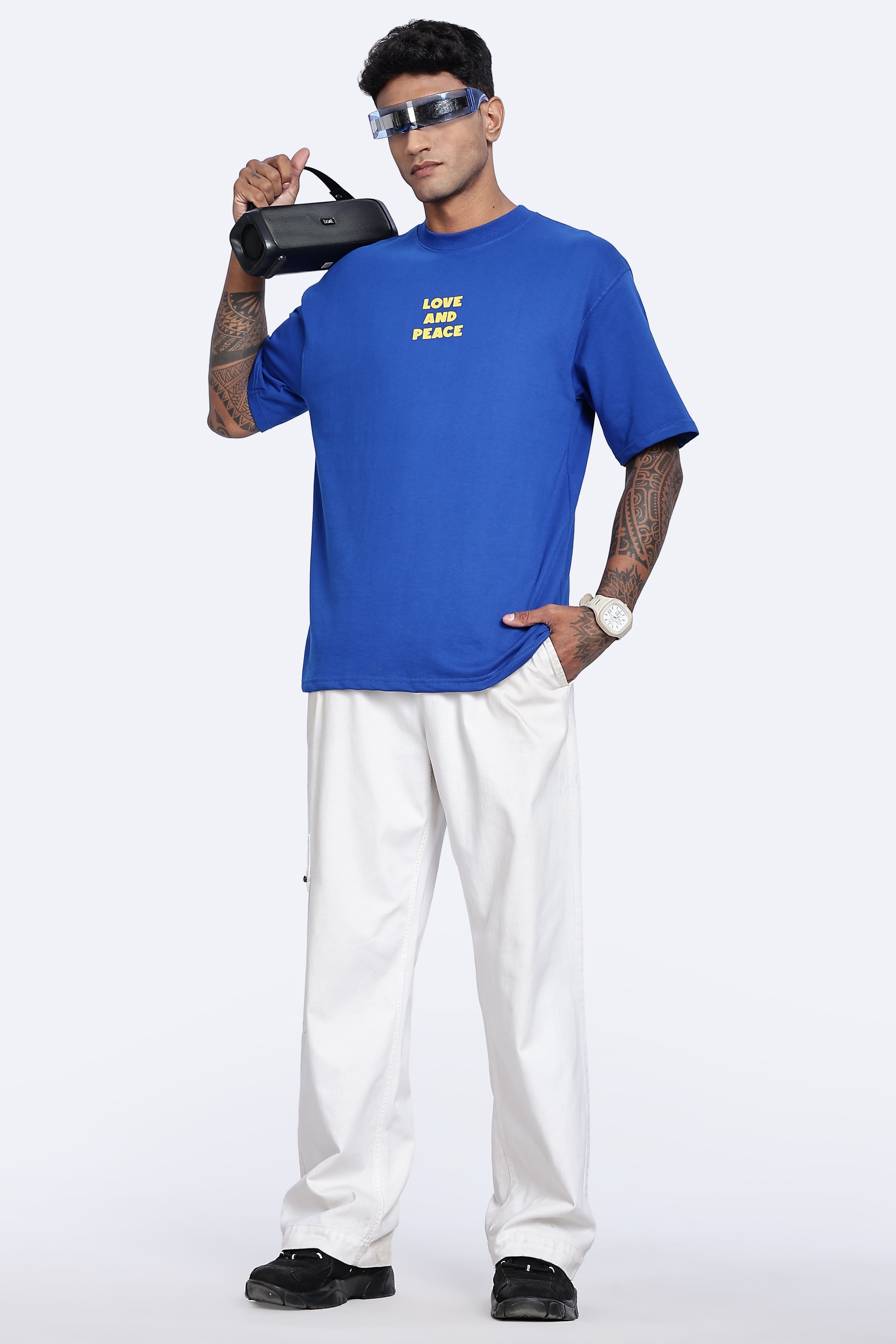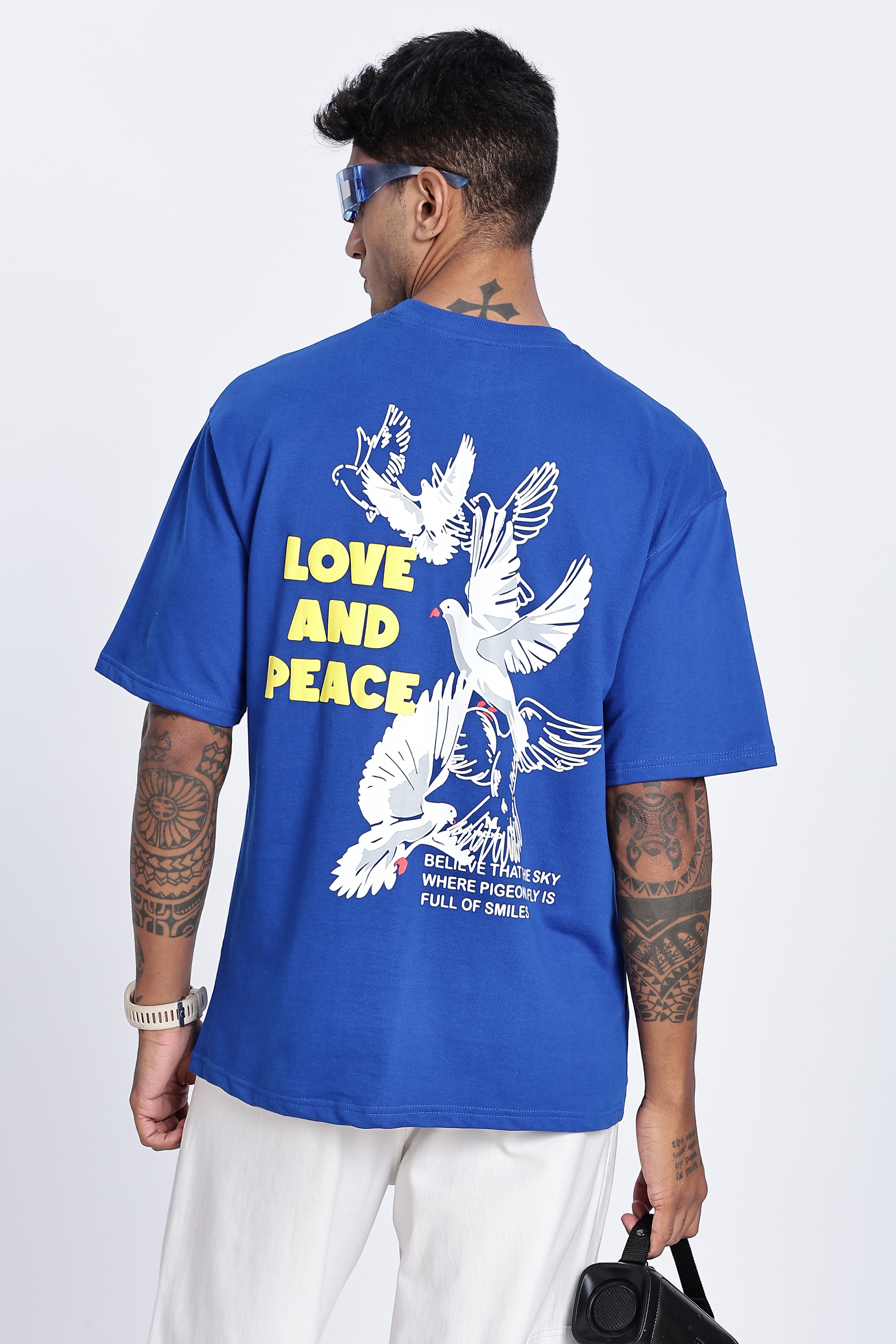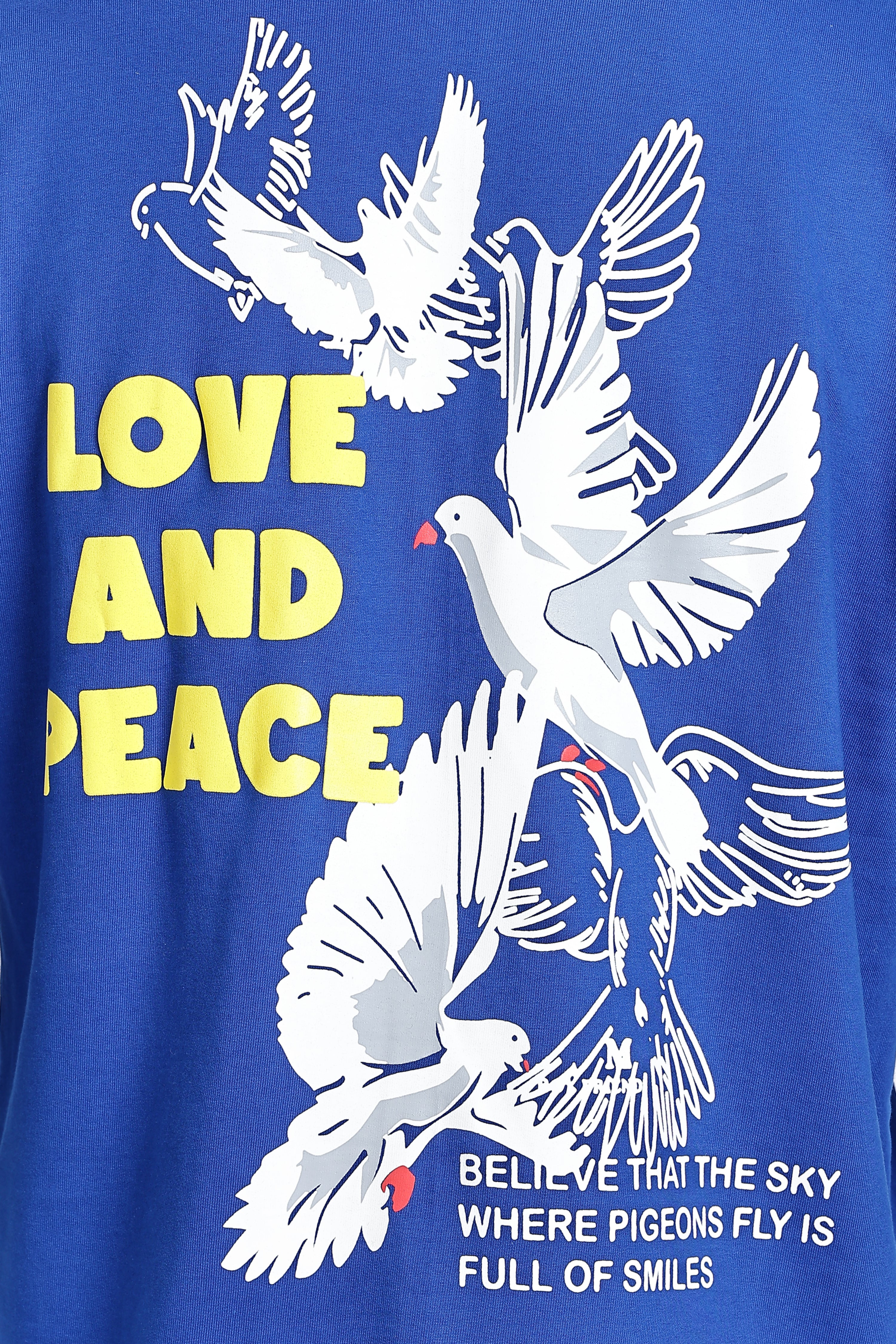 Spread positivity with this striking blue t-shirt featuring uplifting "LOVE AND PEACE" text and soaring white dove graphics on the back. The front keeps it simple with a minimal chest print, while the back tells a story of harmony and freedom in flight.