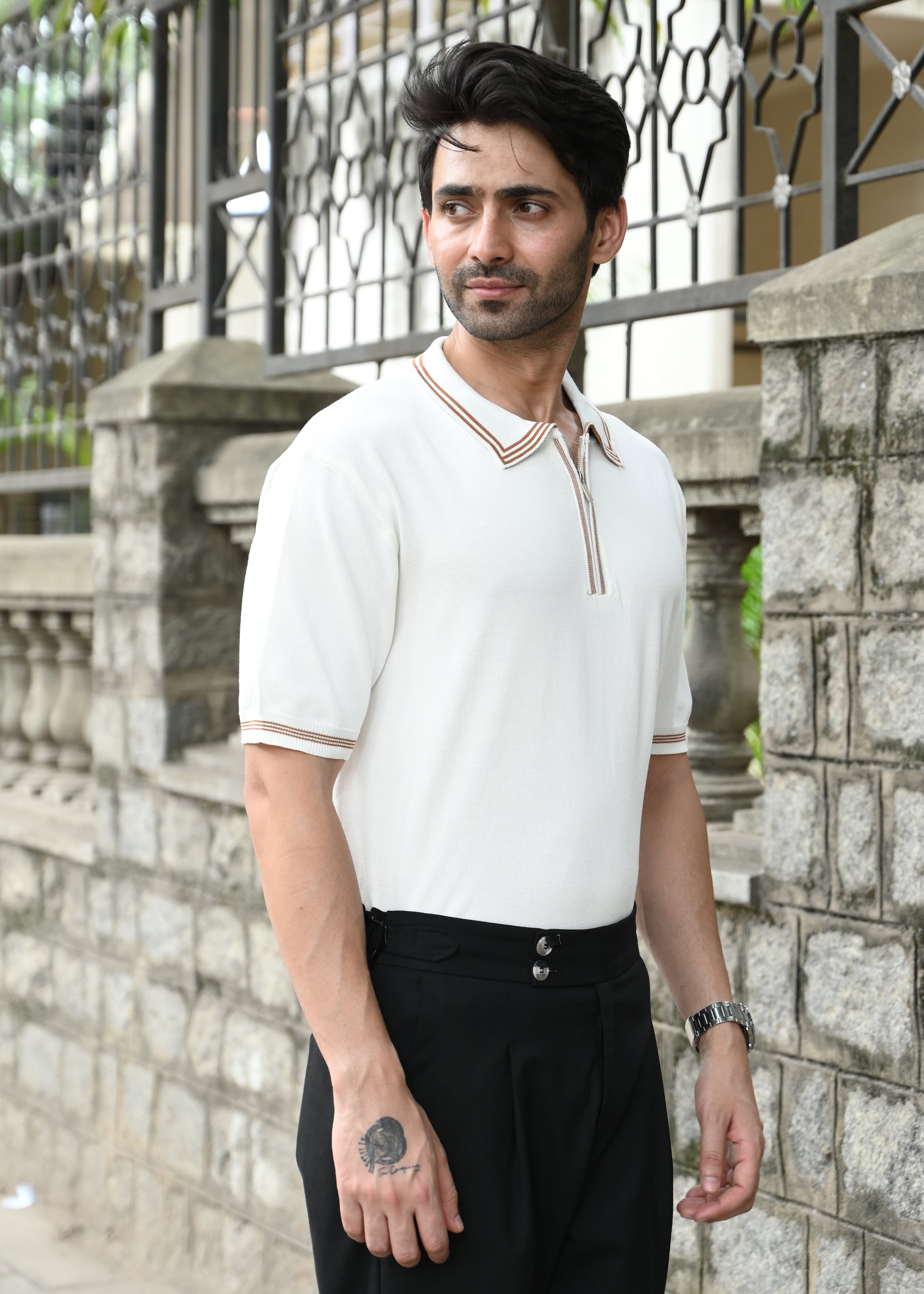 Step into effortless style with this Half Sleeve Polo Zip T-Shirt. Featuring a premium knit fabric for comfort and breathability, this tee combines casual ease with a modern twist. The polo collar is enhanced with striped detailing and a sleek zip-up closure, making it stand out from classic polos. Perfect for casual outings, weekend looks, or smart-casual occasions.