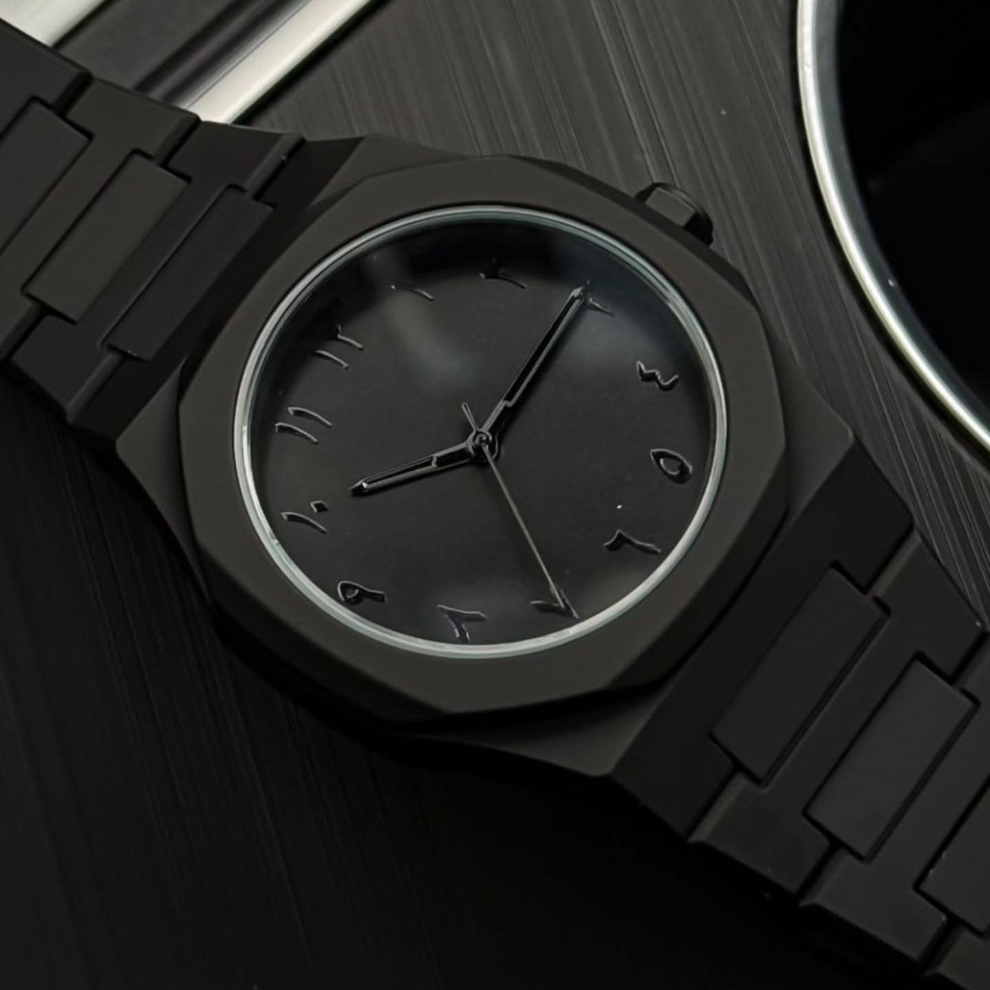 Elevate your style with this sleek matte black timepiece featuring minimalistic design and modern elegance. The watch face showcases embossed Arabic numerals for a unique, cultural touch, while the all-black stainless-steel strap and octagonal bezel offer a bold, contemporary look. Perfect for both casual and formal wear, this watch combines sophistication with understated charm.