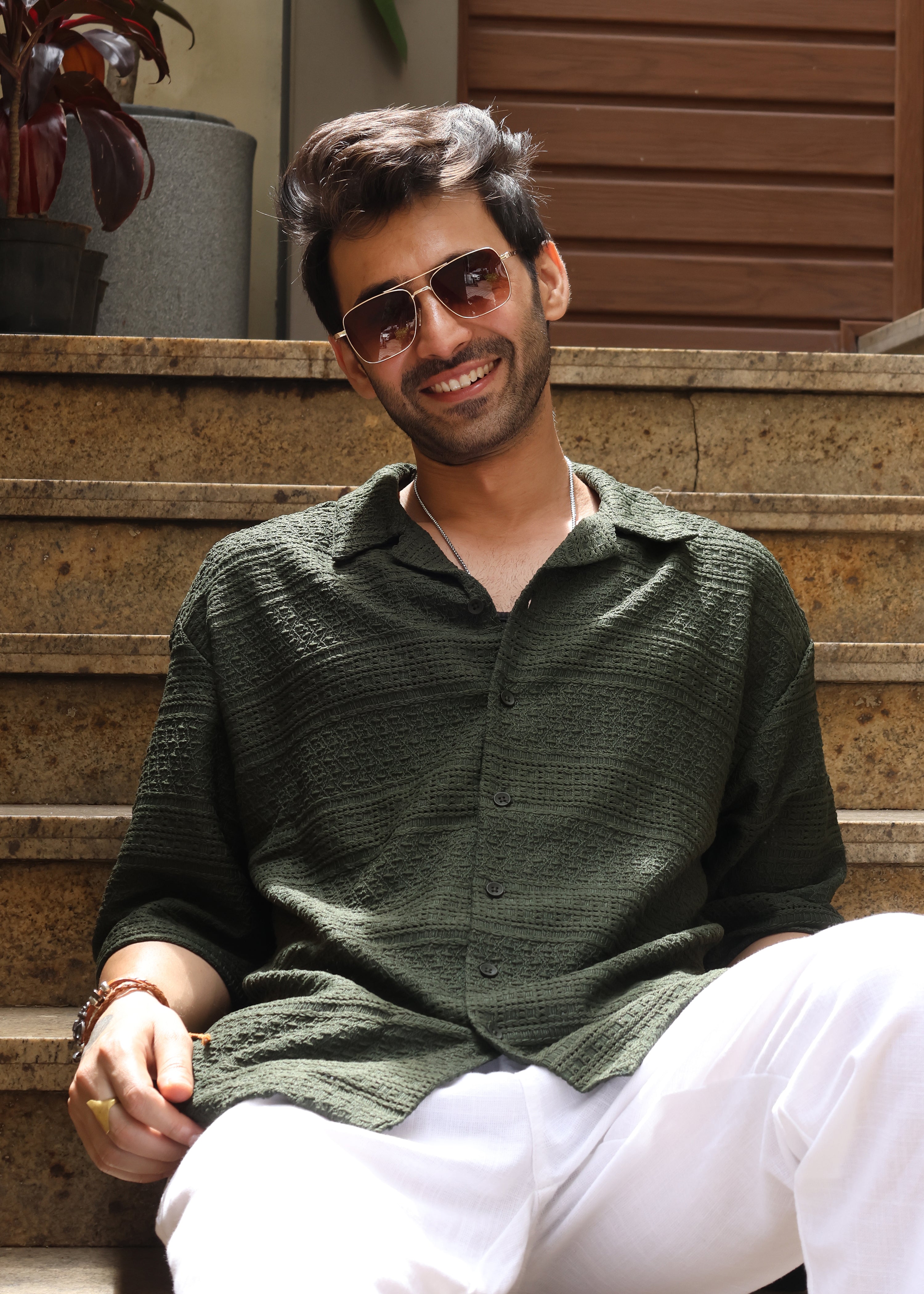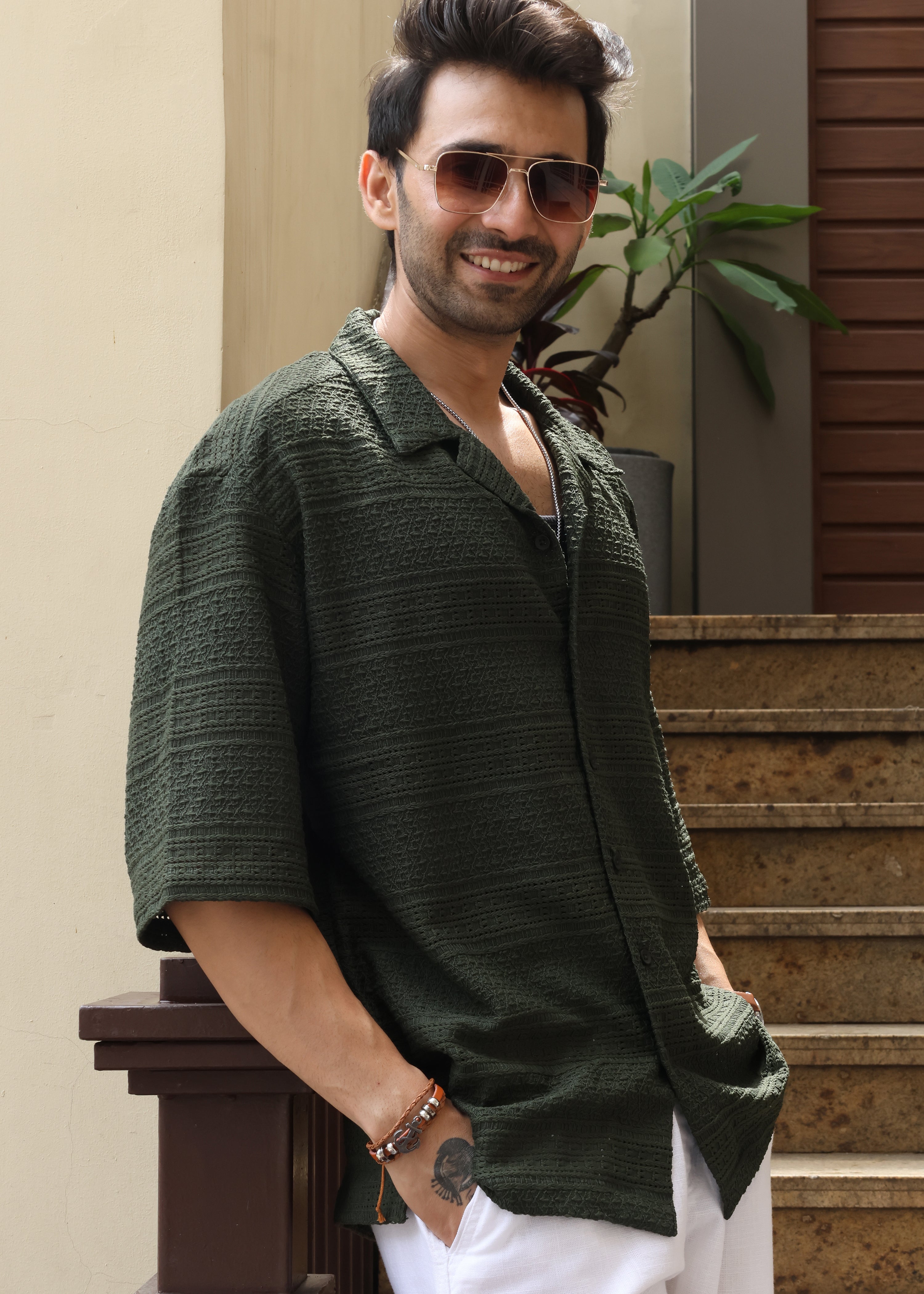 Textured Open-Weave Half-Sleeve Shirt - Green