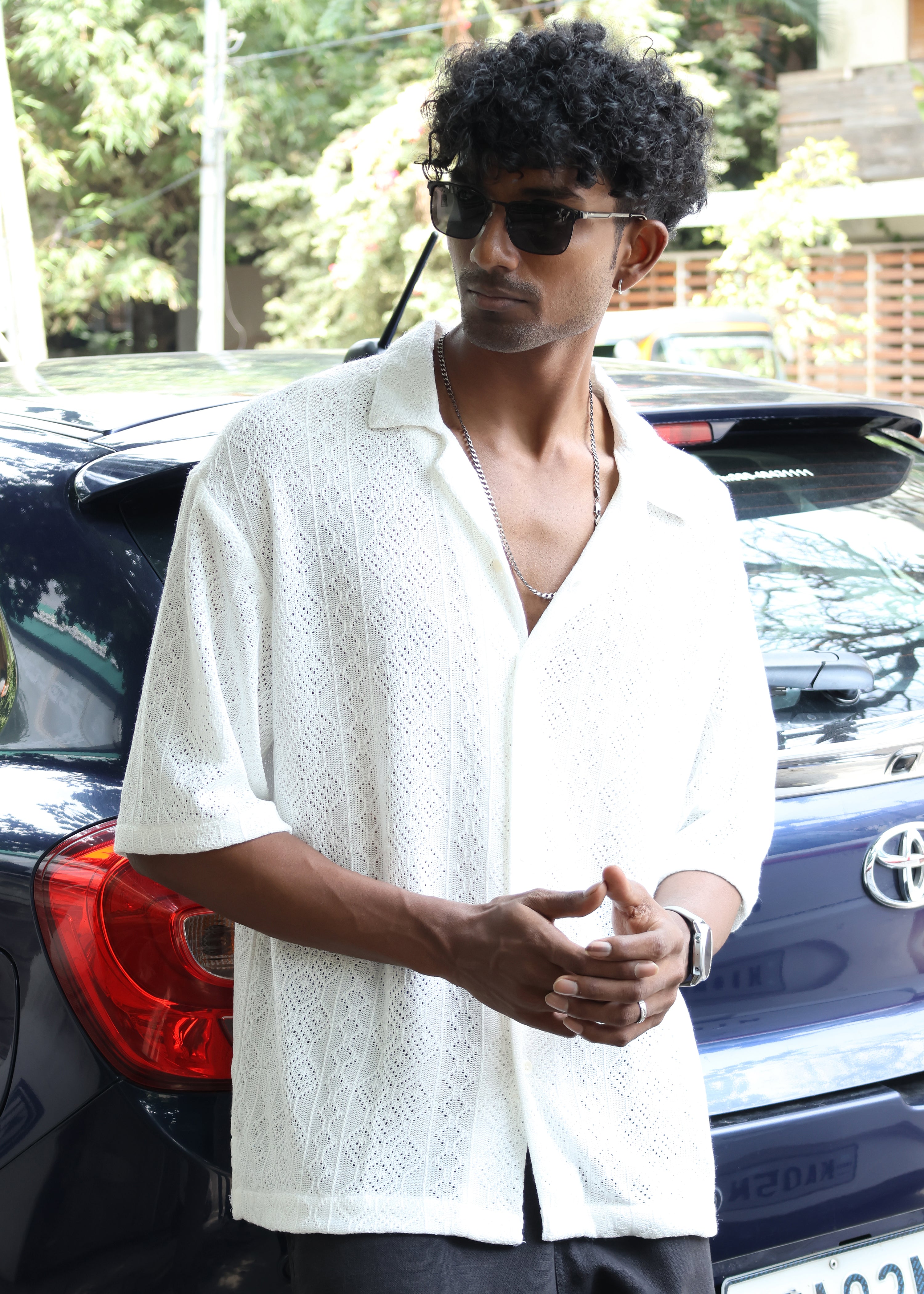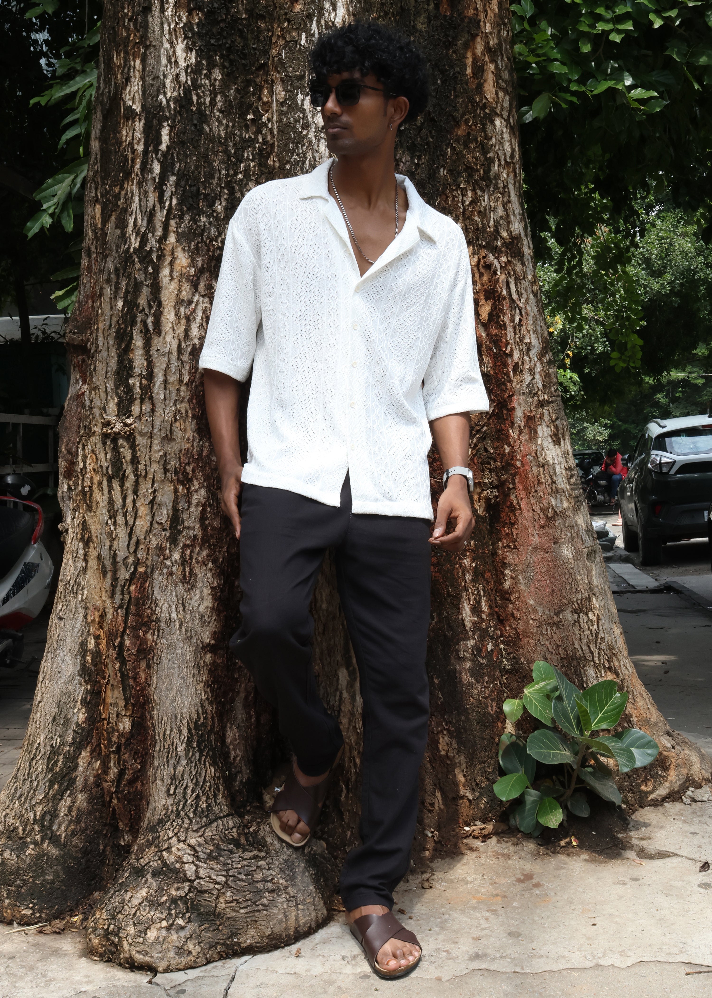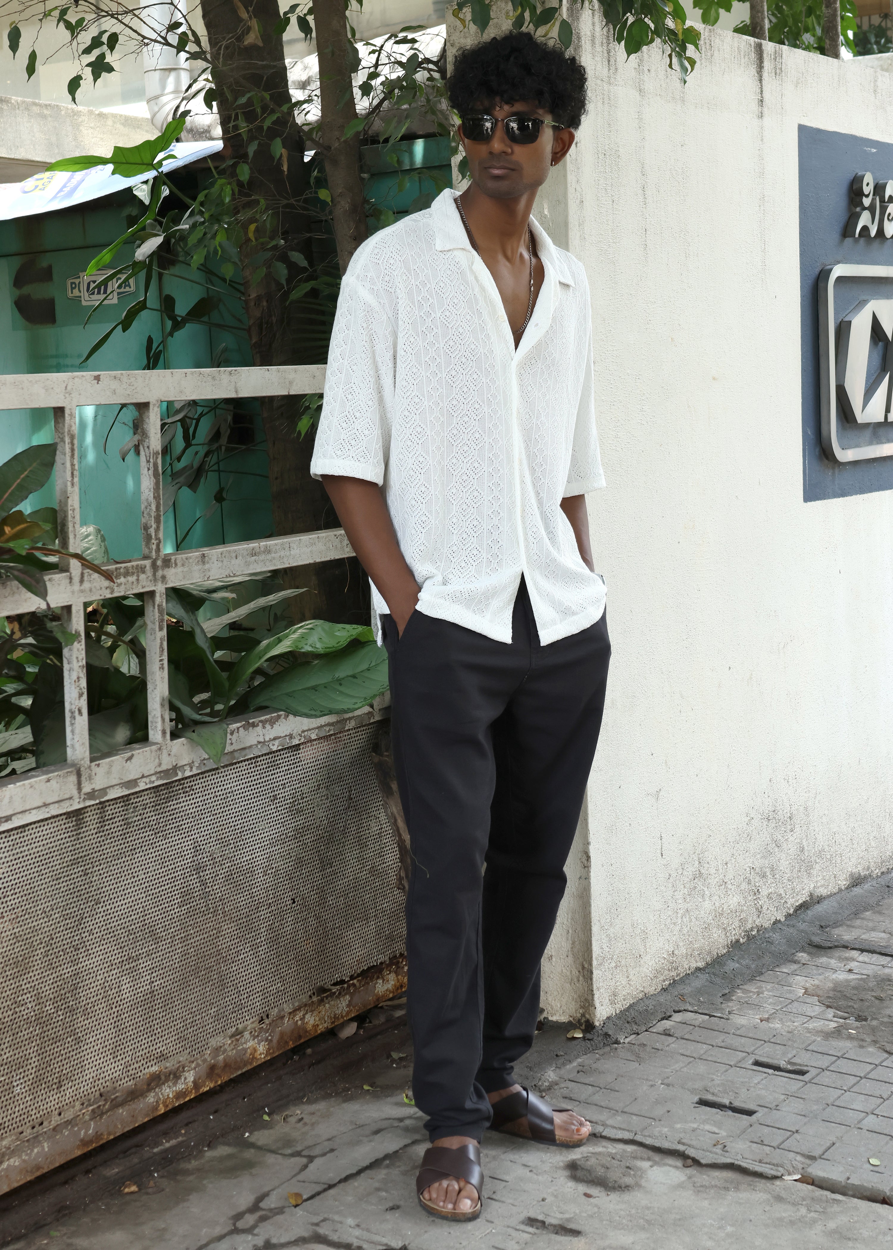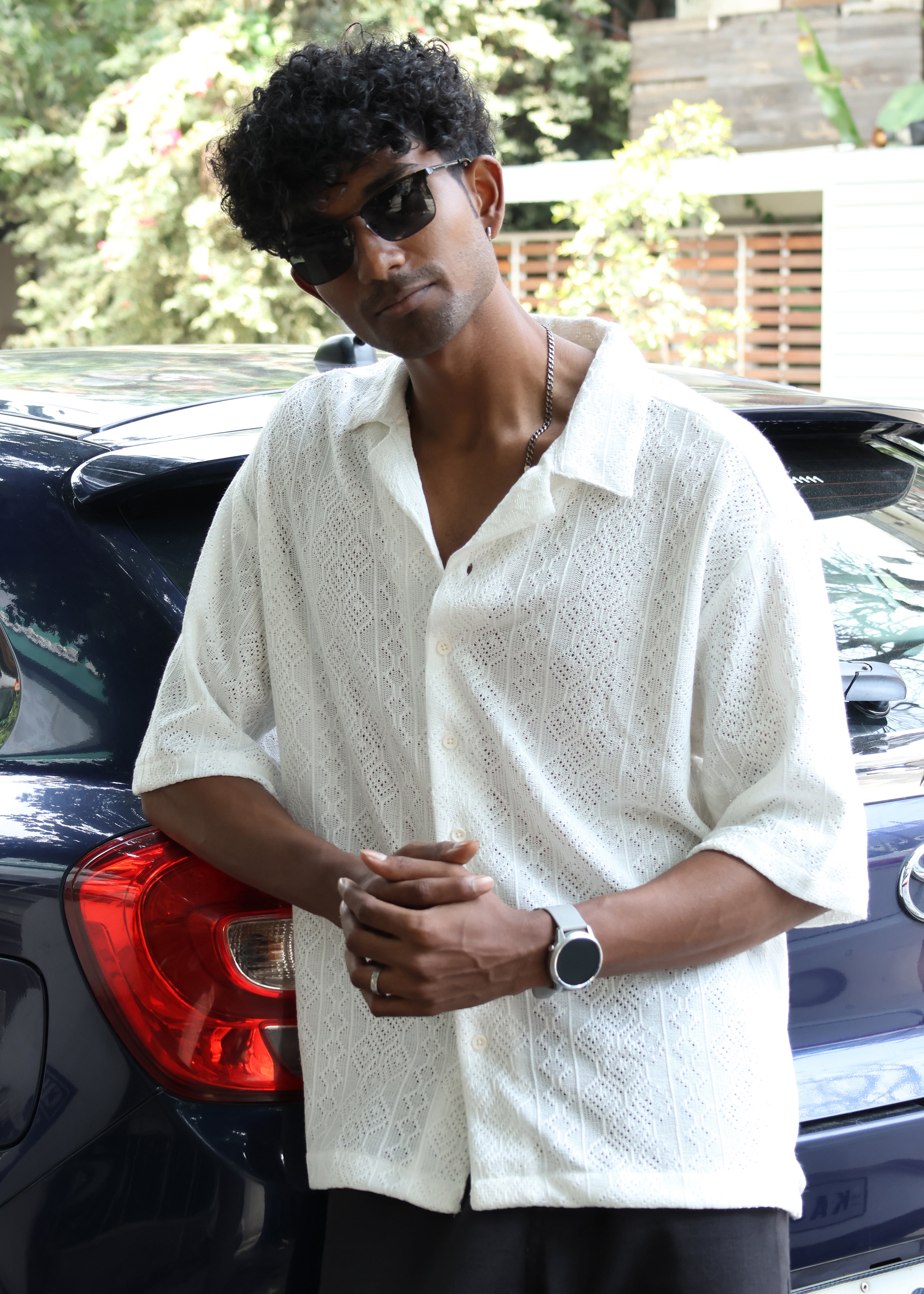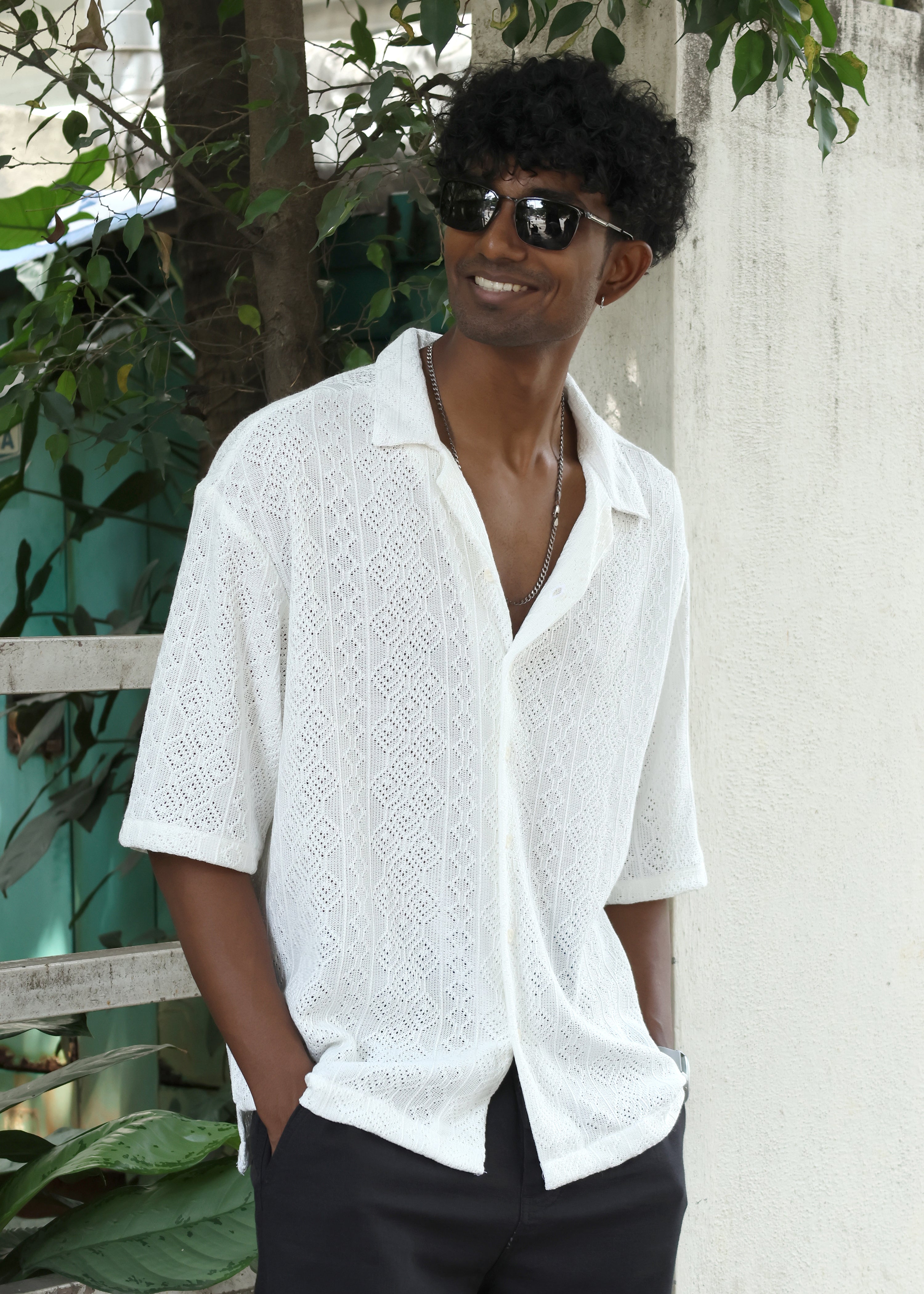 Add a breezy touch to your wardrobe with this textured open-weave half-sleeve shirt. Featuring a relaxed fit and breathable fabric, this shirt is designed for effortless comfort and style. The subtle open-knit detailing enhances its airy feel, making it perfect for warm-weather outings, casual gatherings, or laid-back evenings.
