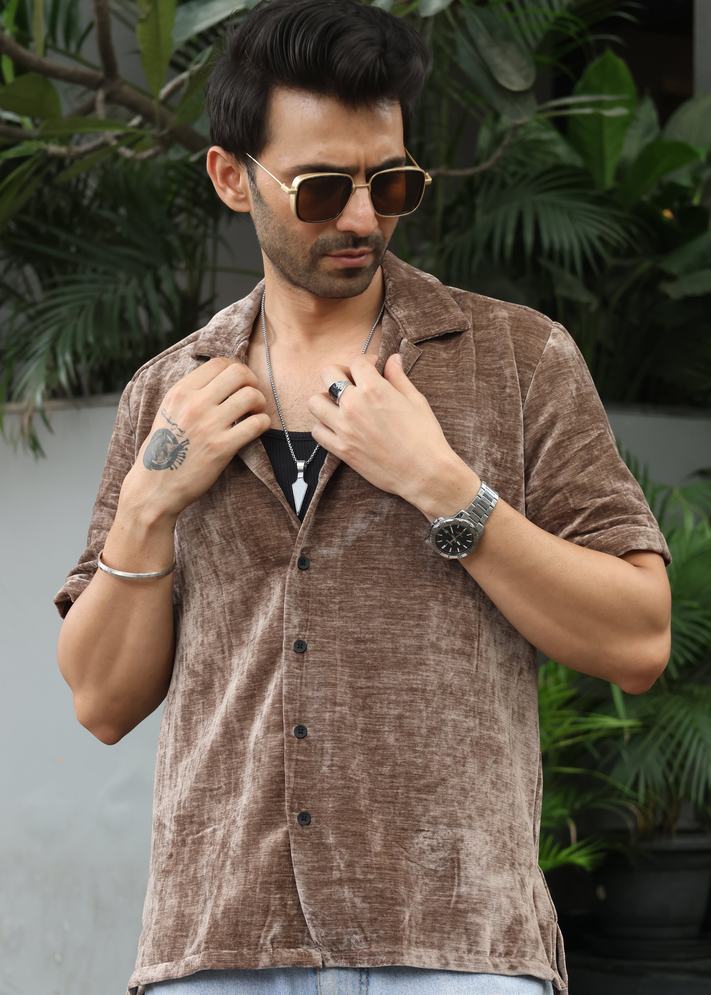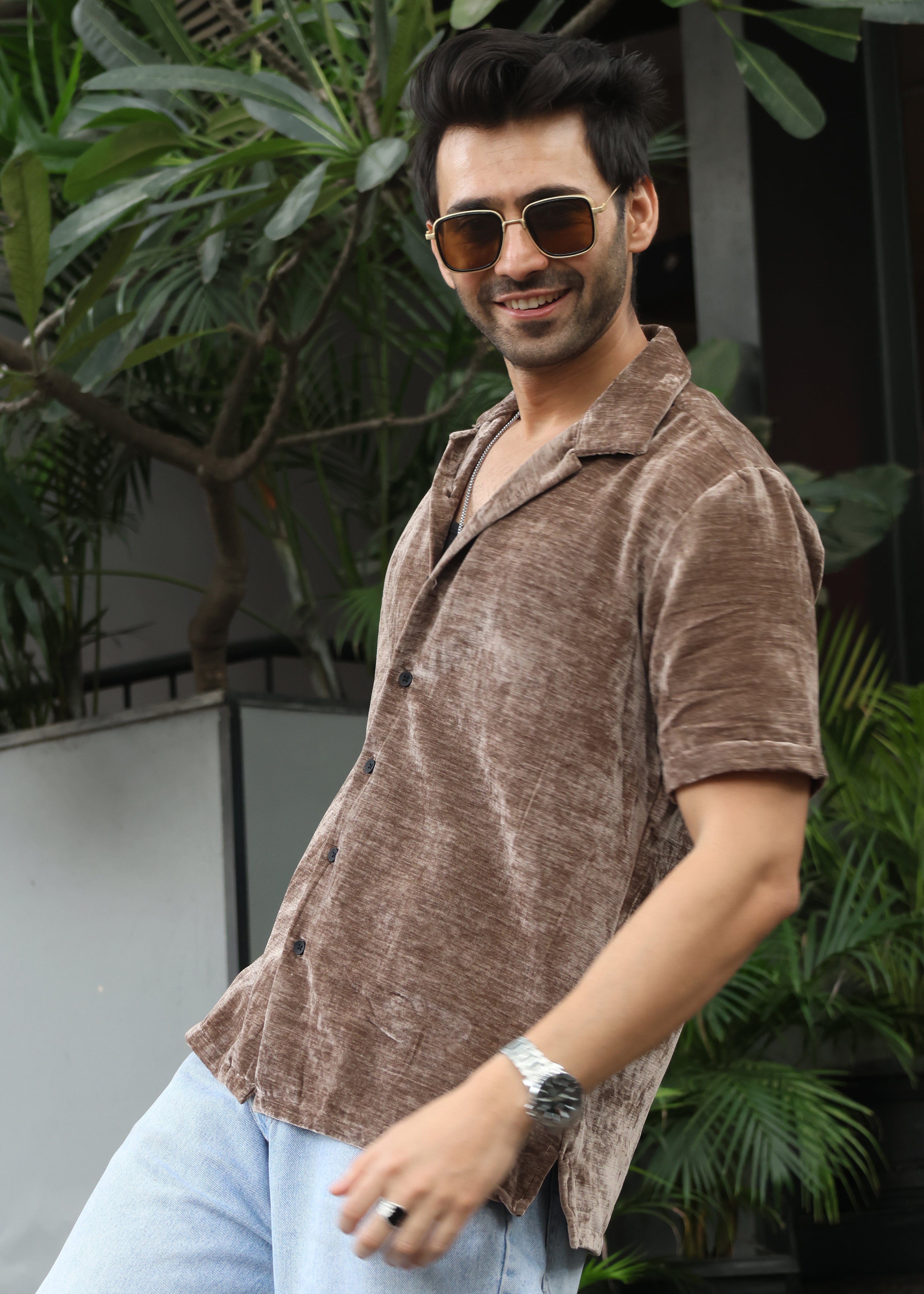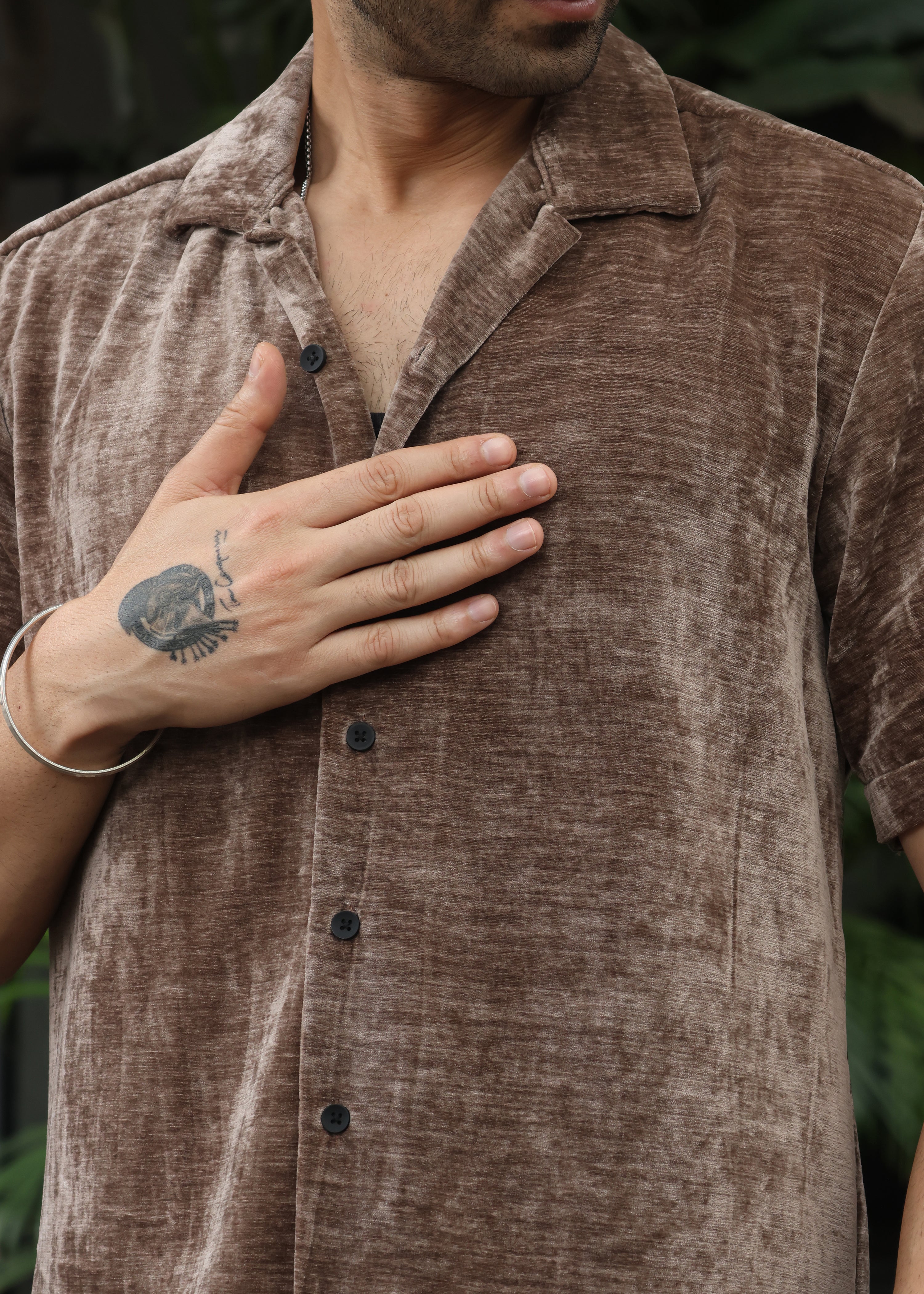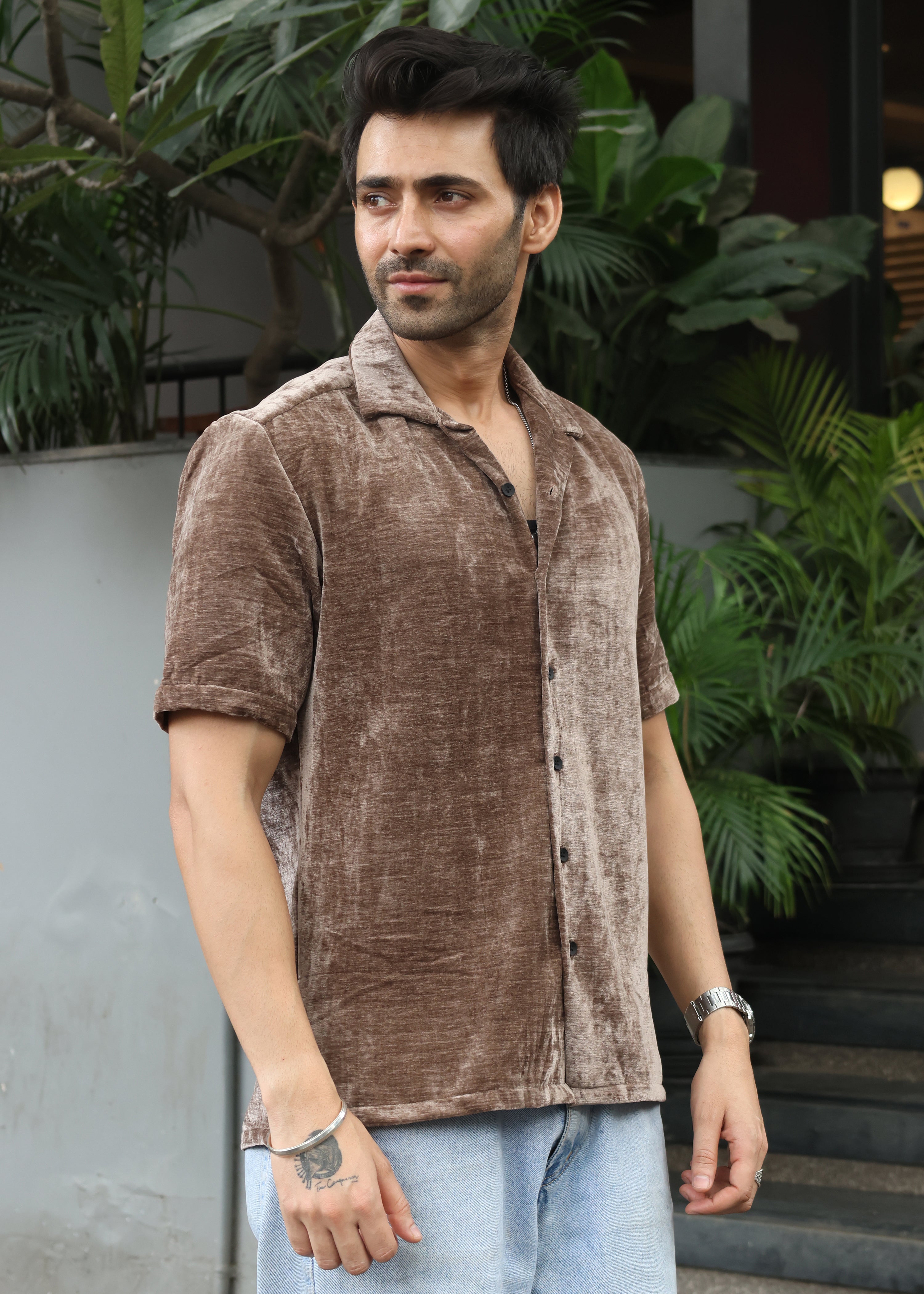 Velvet Half Sleeve Shirt - Brown